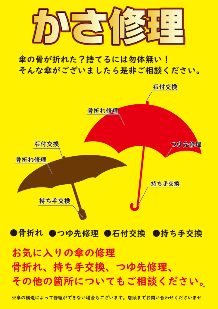 ※ 折りたたみ傘や折れた箇所によって材料が無い為、修理不可能な場合がございます。