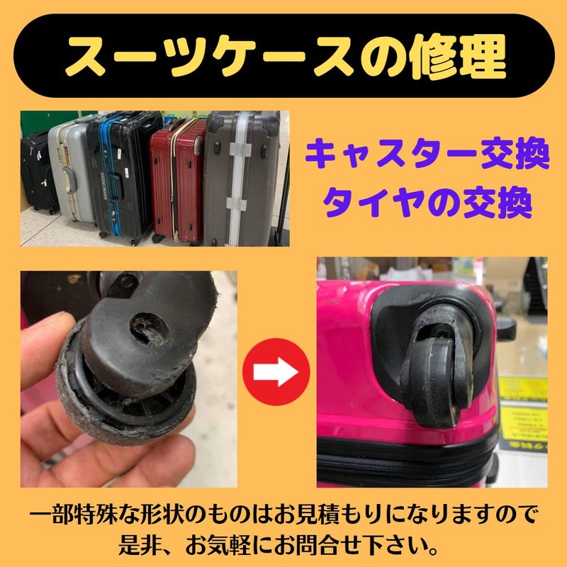 キャスター・タイヤは消耗品ですので交換して使用して頂くものですので、スーツケース、キャリーケース本体を買い換えるのはもったいない!と言う方は是非、当店へお持ち下さい!