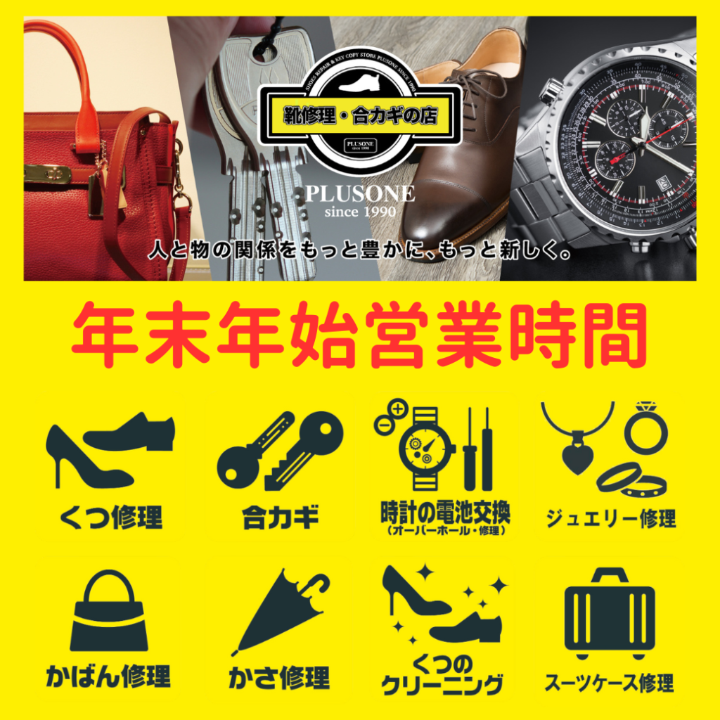 靴修理 合鍵作成 時計の電池交換のお店 プラスワン グループ店舗年末年始営業時間 関西9店舗 九州4店舗 千葉6店舗 グループ19店舗